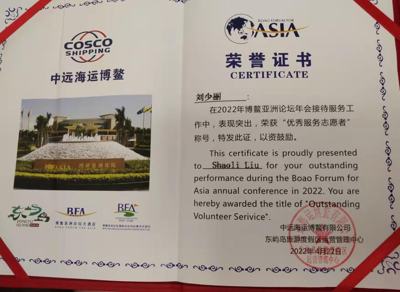 公司2名员工获2022年博鳌亚洲论坛年会“优秀服务志愿者”称号
