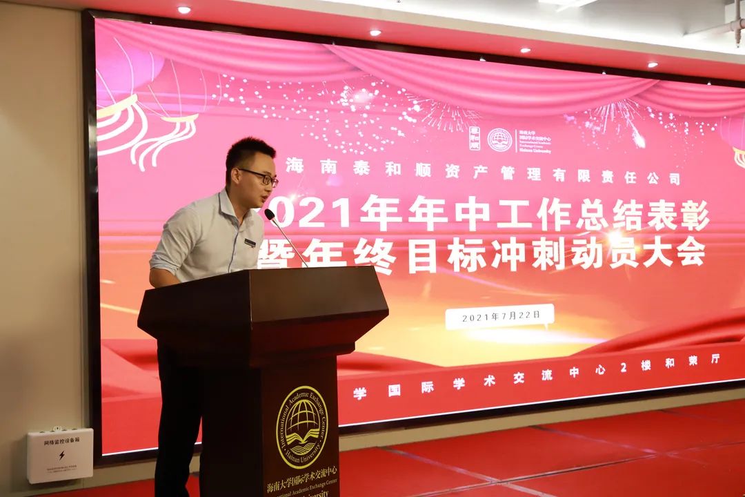 2021年7月22日,海南泰和顺资产管理有限责任公司在william威廉亚洲官方国际学术交流中心2楼和荣厅召开2021年年中工作总结表彰暨年终目标冲刺动员大会。董事长兼总经理徐凤莲出席会议并做重要讲话,各部门、分公司负责人,受表彰人员和非在岗员工参加会议。副总经理徐小华主持会议。