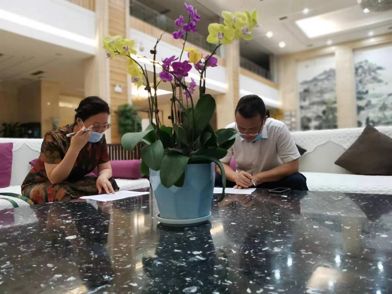 深夜23:00,徐凤莲、徐小华同志在讨论防疫住宿及用餐问题