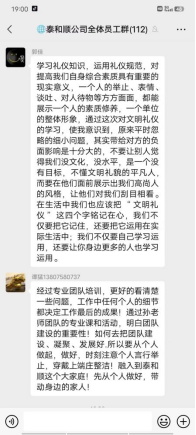 宴会部林艳表示,经过这次礼仪培训,让我深深地了解到团队合作意识的重要性。在工作中,不管是面对客人还是同事,要时刻保持微笑,注意不同场合需要不同的礼仪礼节、礼貌用语。接待客人时也要多注重细节,为客人着想。俗话说“细节决定成败,态度决定一切,心态决定人生”,通过培训,让我收获满满,也会在工作中学以致用,同时感谢公司给我们的学习机会!