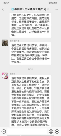 客房部领班陈杏说,本次学习开拓了我的视野,让我受益匪浅。礼仪是一张交际名片,能够帮助我们规范言谈举止,教会我们待人接物。“教养体现于细节,细节展示素质”,我将在以后的工作生活中努力前行,学以致用,任何事情,从细节出发,从小事着手,以更高标准服务好每一位宾客。