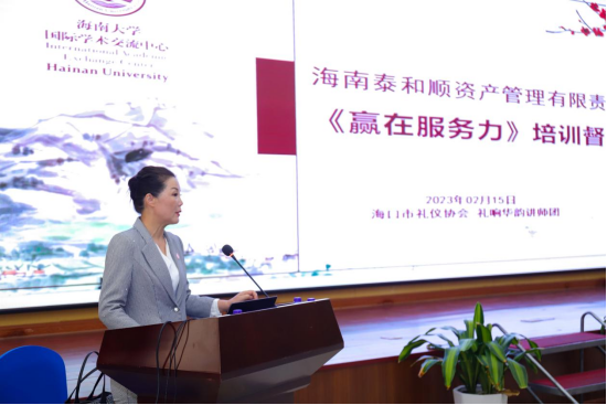 为进一步规范服务礼仪,提升服务“软实力”,服务好“首届东坡文化国际高端论坛”会务,2月15日、16日,公司邀请海南省礼仪协会执行会长、海口市礼仪协会会长、国家一级企业培训师、中国高职院校教师礼仪大赛评委、国际旅游岛文明礼仪导航、中国十大女性培训师——孙岚会长及其团队对全体员工进行《赢在服务力》礼仪督导项目培训。