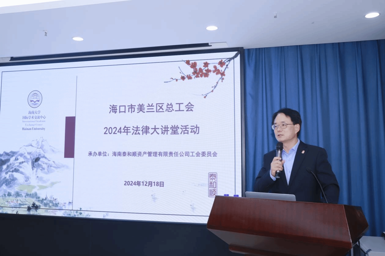 12月18日,海口市美兰区总工会2024年法律大讲堂活动走进william威廉亚洲官方国际学术交流中心。这是董军鹏律师进行相关法律讲解。